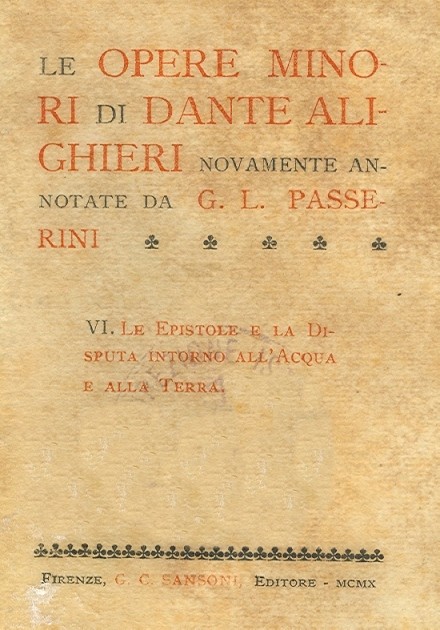 | Titolo completo | 6: Le epistole e la Disputa intorno all'acqua e alla terra / di Dante Alighieri ; novamente annotate da G. L. Passerini |