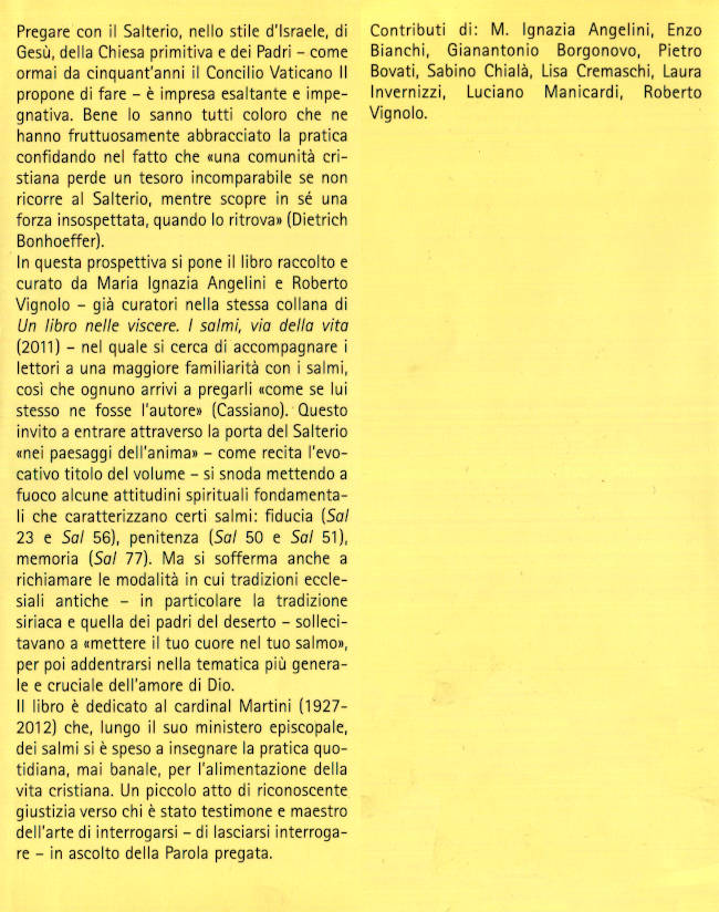 | Titolo completo | Nei paesaggi dell'anima : come i salmi diventano preghiera / a cura di Maria Ignazia Angelini e Roberto Vignolo |