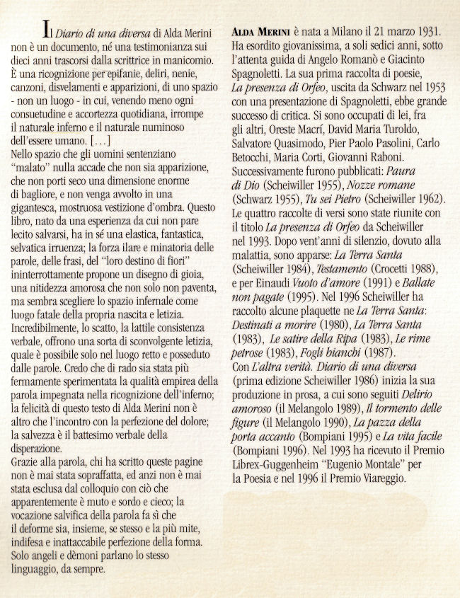 | Titolo completo | L'altra verità : diario di una diversa / Alda Merini ; prefazione di Giorgio Manganelli |