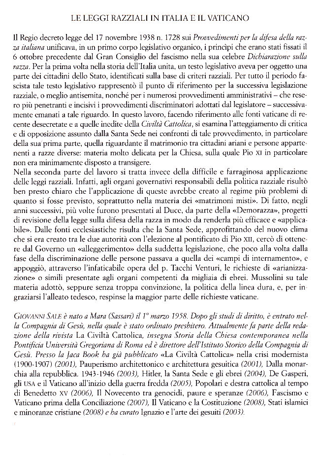 | Titolo completo | Le leggi razziali in Italia e il Vaticano / Giovanni Sale ; saggio introduttivo di Emma Fattorini |