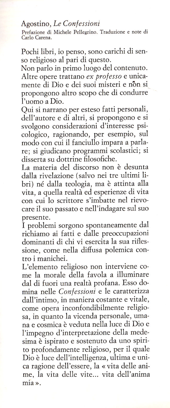 | Titolo completo | Le Confessioni / Agostino ; prefazione di Michele Pellegrino ; traduzione e note di Carlo Carena |
