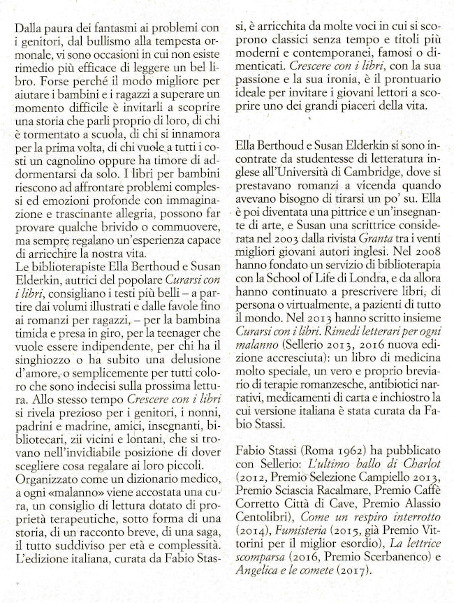 | Titolo completo | Crescere con i libri : rimedi letterari per mantenere i bambini sani, saggi e felici / Ella Berthoud, Sausan Elderkin ; a cura di Fabio Stassi ; traduzione di Roberto Serrai |