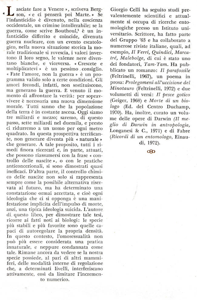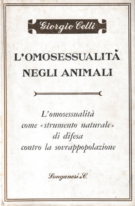 | Titolo completo | L'omosessualità negli animali : l'mosessualità come strumento naturale di difesa contro la sovrappopolazione / di Giorgio Celli |