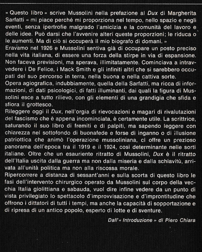 | Titolo completo | Dux / Margherita Sarfatti ; introduzione di Piero Chiara ; prefazione di Benito Mussolini |