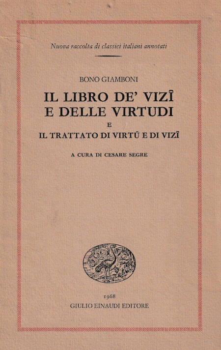 | Titolo completo | Il libro de' vizi e delle virtdi e Il trattato di virt e di vizi / Bono Giamboni ; a cura di Cesare Segre |