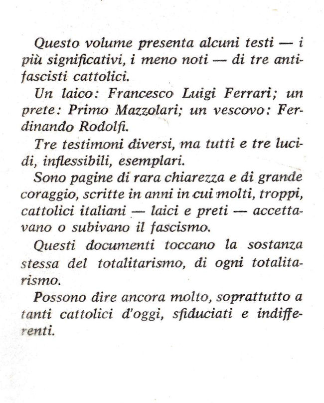 | Titolo completo | Antifascisti cattolici / [scritti di] Francesco Luigi Ferrari, Primo Mazzolari, Ferdinando Rodolfi |