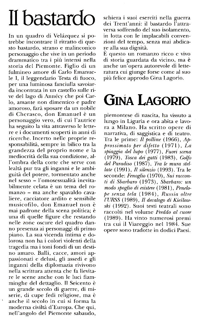 | Titolo completo | Il bastardo, ovvero Gli amori, i travagli e le lacrime di Don Emanuel di Savoia / Gina Lagorio |