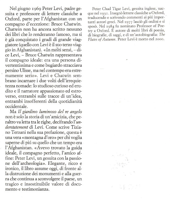| Titolo completo | Il giardino luminoso del re angelo : un viaggio in Afghanistan con Bruce Chatwin / Peter Levi ; prefazione di Tiziano Terzani ; con uno scritto di Maurizio Tosi ; traduzione di Marco Bosonetto |