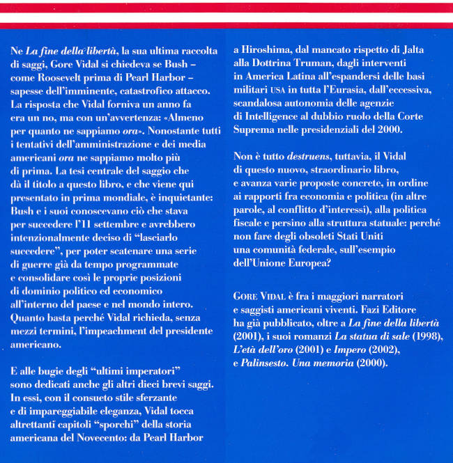 | Titolo completo | Le menzogne dell'impero e altre tristi verità : perché la junta petroliera Cheney-Bush vuole la guerra con l'Iraq e altri saggi / Gore Vidal ; traduzione di Luca Scarlini e di Laura Pugno |
