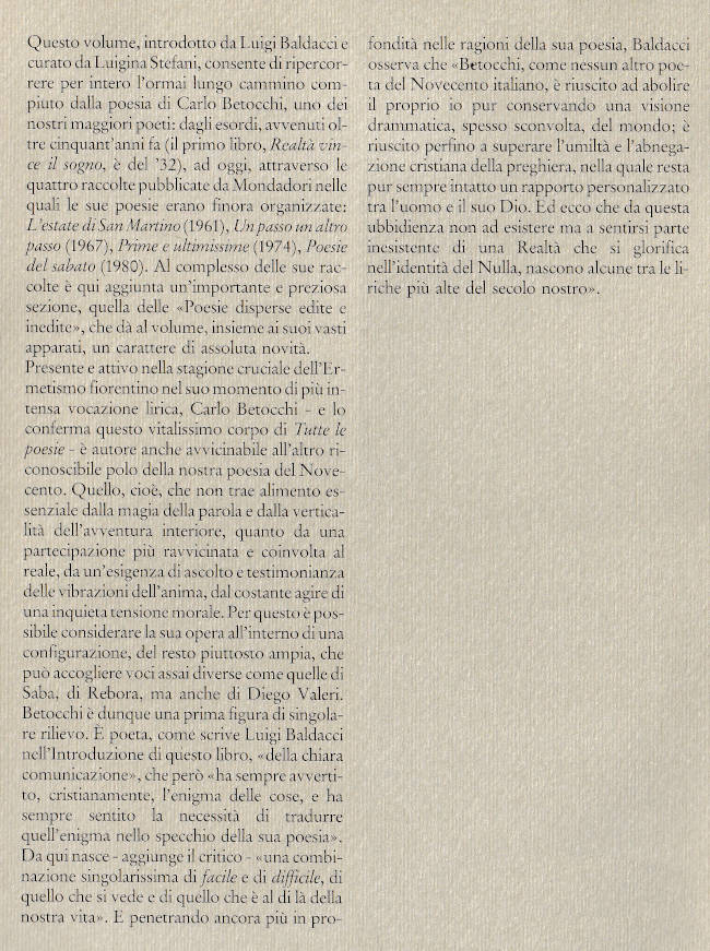 | Titolo completo | Tutte le poesie / Carlo Betocchi ; introduzione di Luigi Baldacci ; nota ai testi di Luigina Stefani |