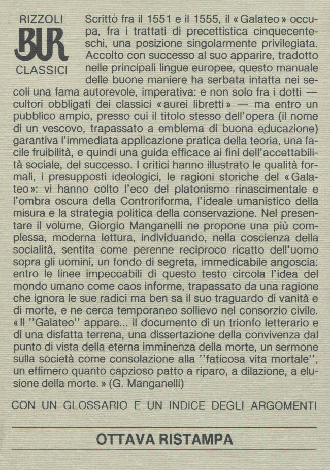 | Titolo completo | Galateo / Giovanni Della Casa ; introduzione di Giorgio Manganelli ; premessa al testo e note di Claudio Milanini |