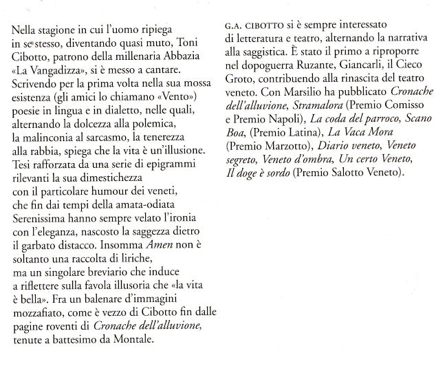 | Titolo completo | Amen : versi in lingua e in dialetto / G.A. Cibotto ; premessa di Giancarlo Marinelli |