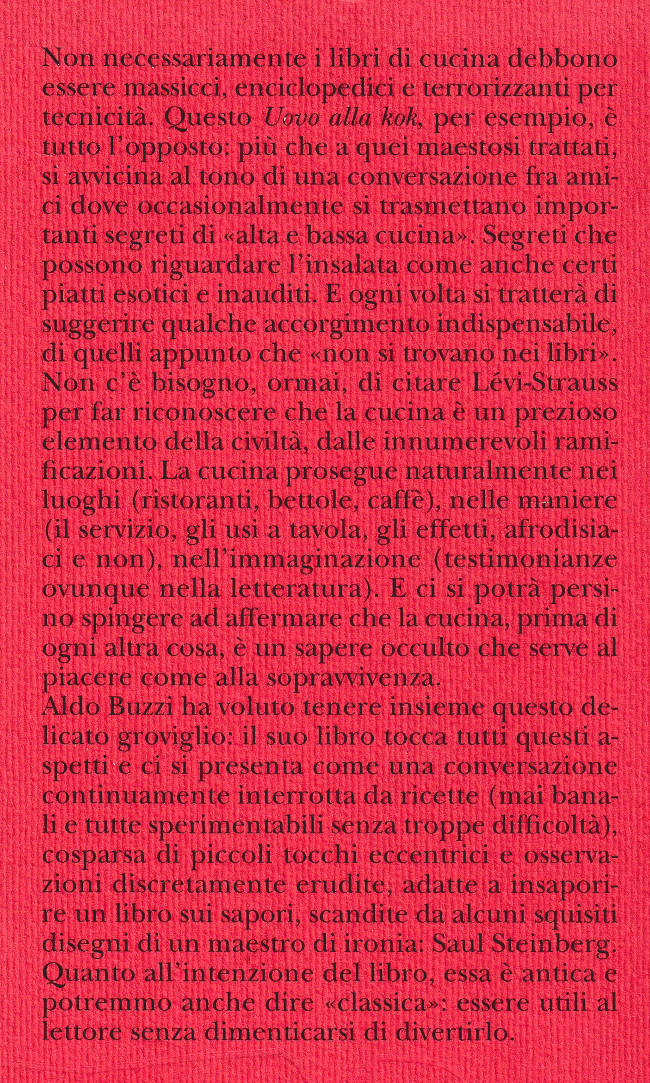 | Titolo completo | L'uovo alla kok : ricette, curiosità, segreti di alta e bassa cucina, dall'insalata all'acqua / Aldo Buzzi ; con quattordici disegni di Saul Steinberg |