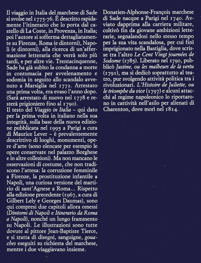 | Titolo completo | Viaggio in Italia, ovvero Dissertazioni critiche, storiche e filosofiche sulle città di Firenze, Roma, Napoli e Loreto, e sulle strade adiacenti a queste quattro città / Donatien-Alphonse-Francois marchese di Sade ; edizione stabilita e presentata da M |