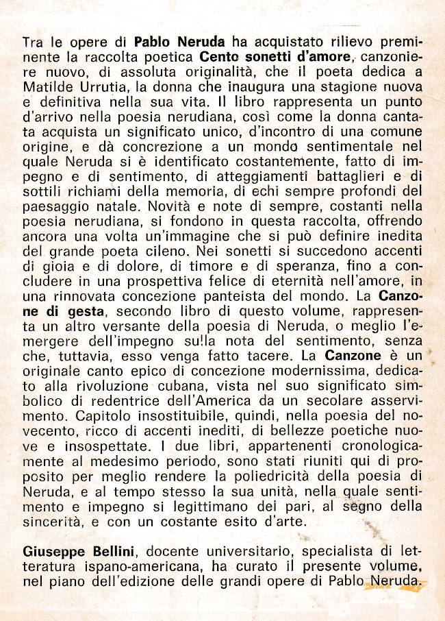 | Titolo completo | Cento sonetti d'amore ; Canzone di gesta / Pablo Neruda ; a cura di Giuseppe Bellini |