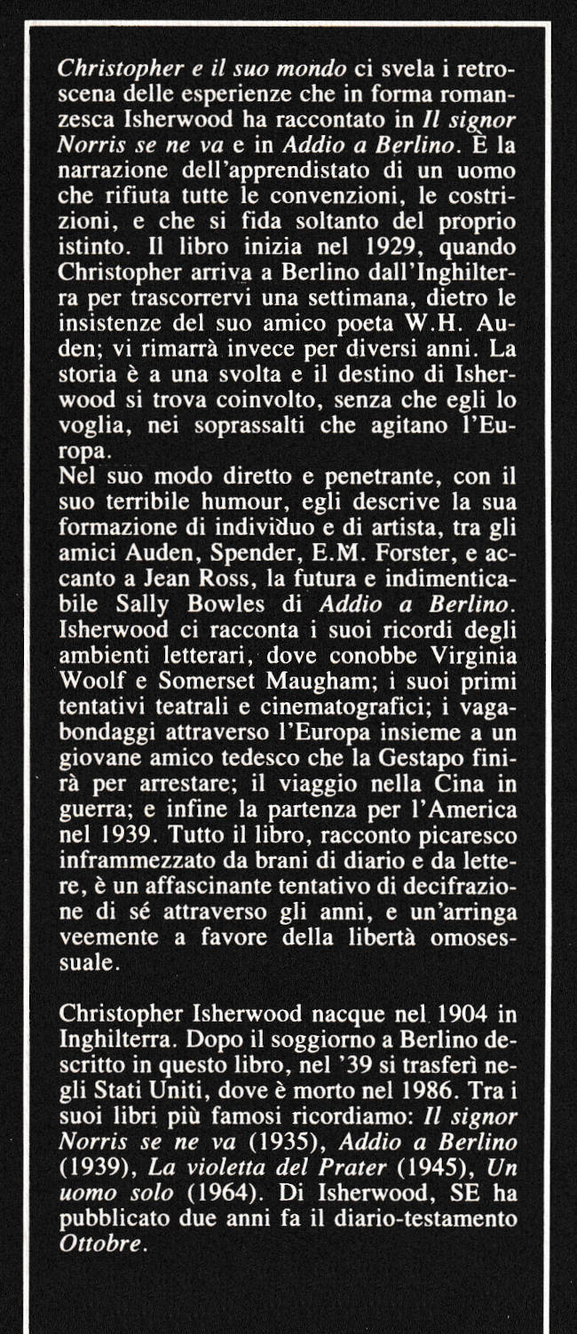 | Titolo completo | Christopher e il suo mondo : 1929-1939 / Christopher Isherwood ; traduzione di Giancarlo Pavanello |