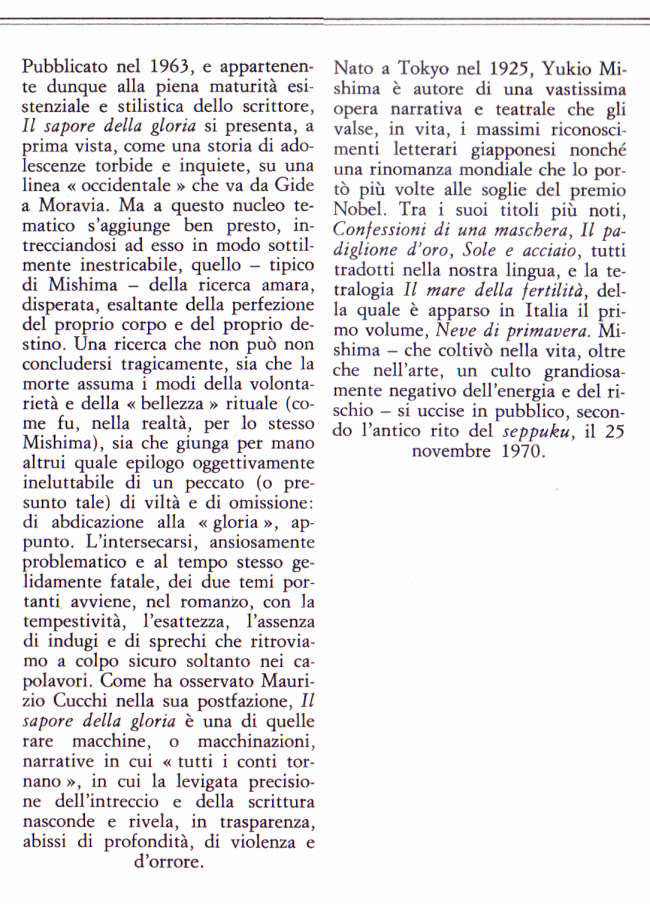| Titolo completo | Il sapore della gloria : romanzo / Yukio Mishima ; traduzione dall'originale giapponese di Mario Teti ; postfazione di Maurizio Cucchi |