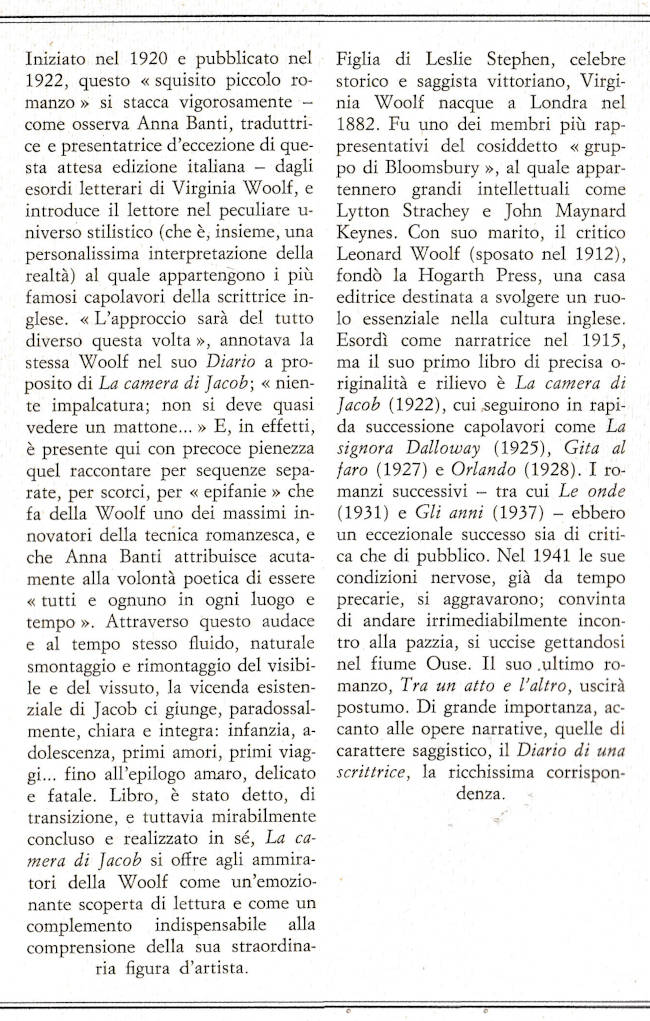 | Titolo completo | La camera di Jacob : romanzo / Virginia Woolf ; traduzione e postfazione di Anna Banti |
