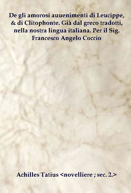 | Titolo completo | De gli amorosi auuenimenti di Leucippe, & di Clitophonte. Già dal greco tradotti, nella nostra lingua italiana. Per il Sig. Francesco Angelo Coccio / Achille Tatio, alessandrino |