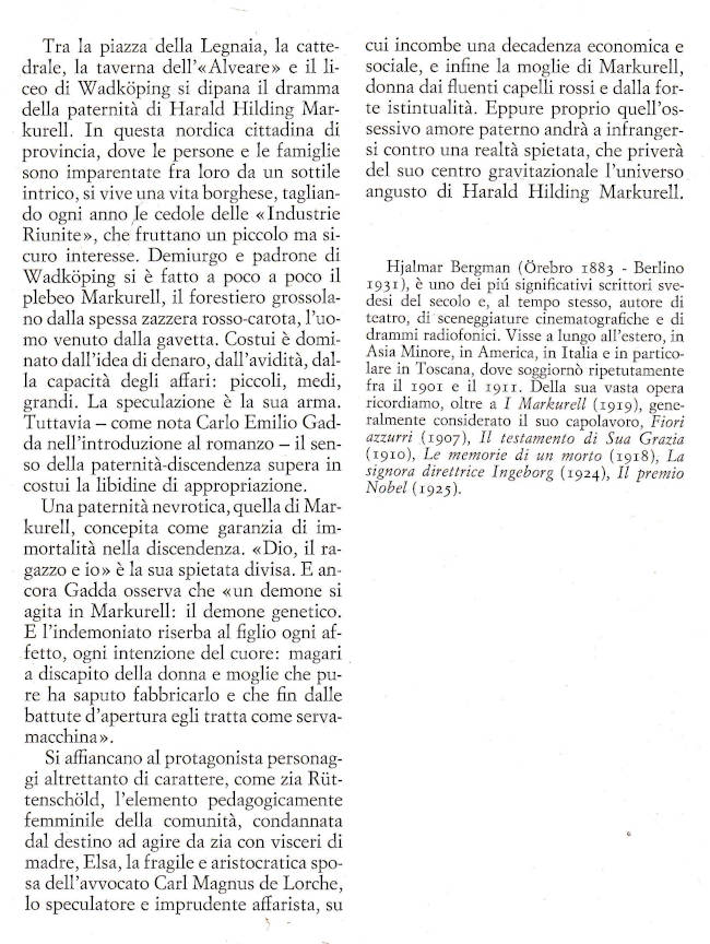 | Titolo completo | I Markurell / Hjalmar Bergman ; introduzione di Carlo Emilio Gadda ; traduzione di Adamaria Terziani ; nota di Ludovica Koch |