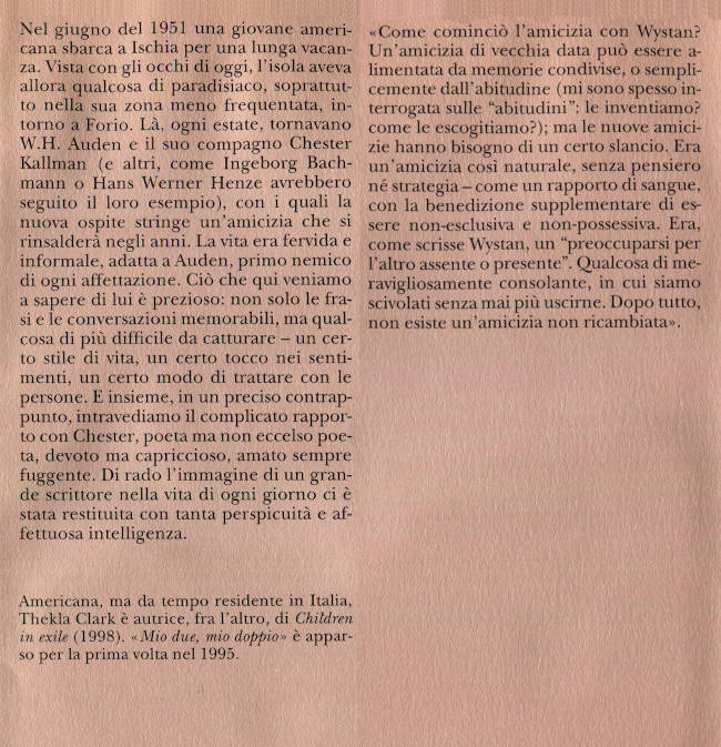 | Titolo completo | Mio due, mio doppio : storia di W.H. Auden e Chester Kallman / Thekla Clark ; introduzione di James Fenton ; traduzione di Giovanni Ferrara degli Uberti |