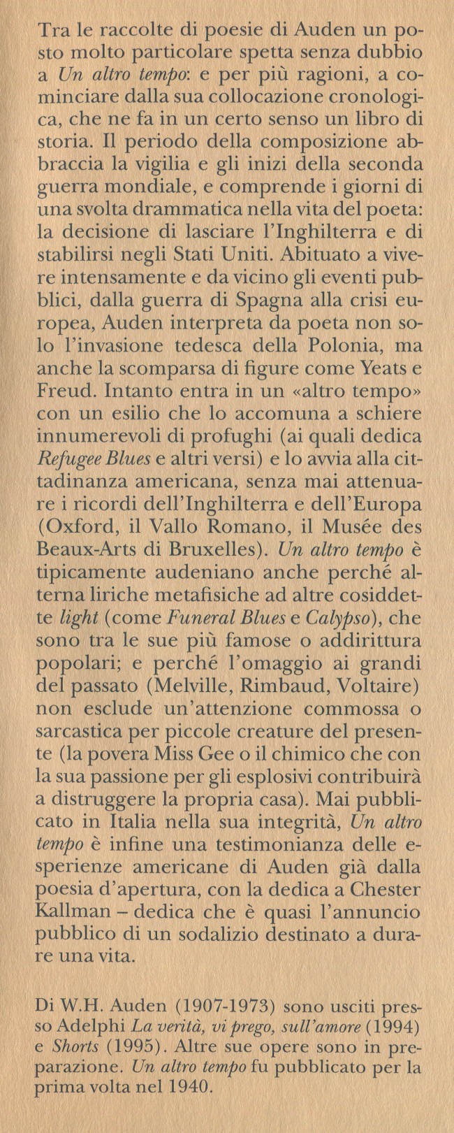 | Titolo completo | Un altro tempo / W. H. Auden ; edizione con testo a fronte a cura di Nicola Gardini |