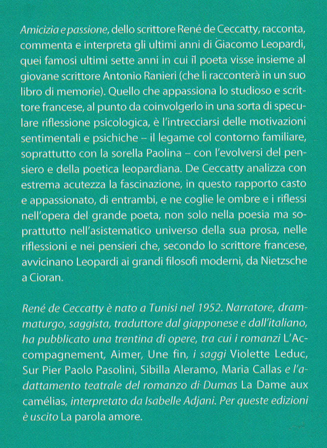 | Titolo completo | Amicizia e passione : Giacomo Leopardi a Napoli / René De Ceccatty ; a cura di Piero Gelli |