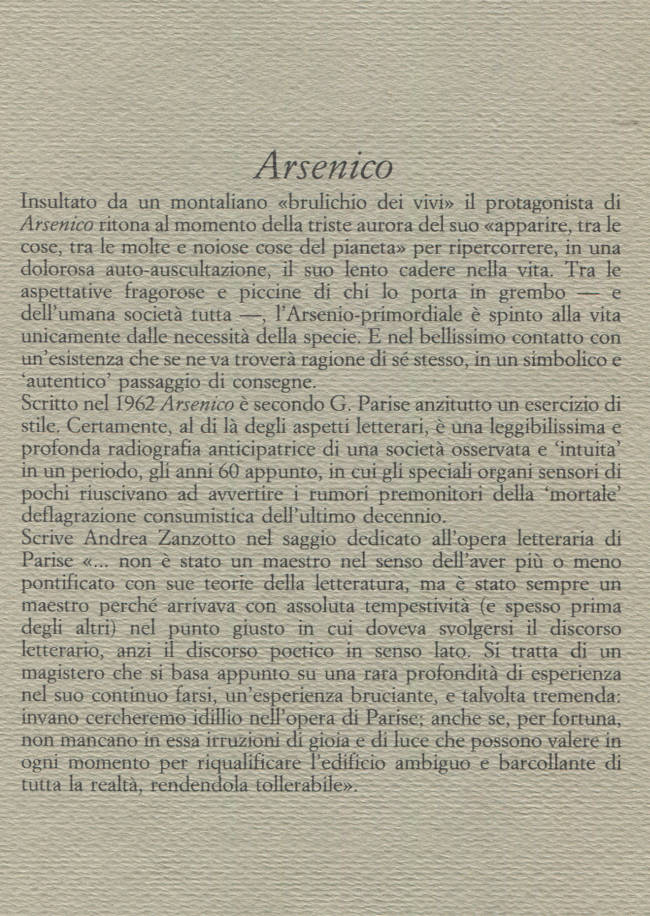 | Titolo completo | Arsenico / Goffredo Parise ; con un saggio di Andrea Zanzotto |