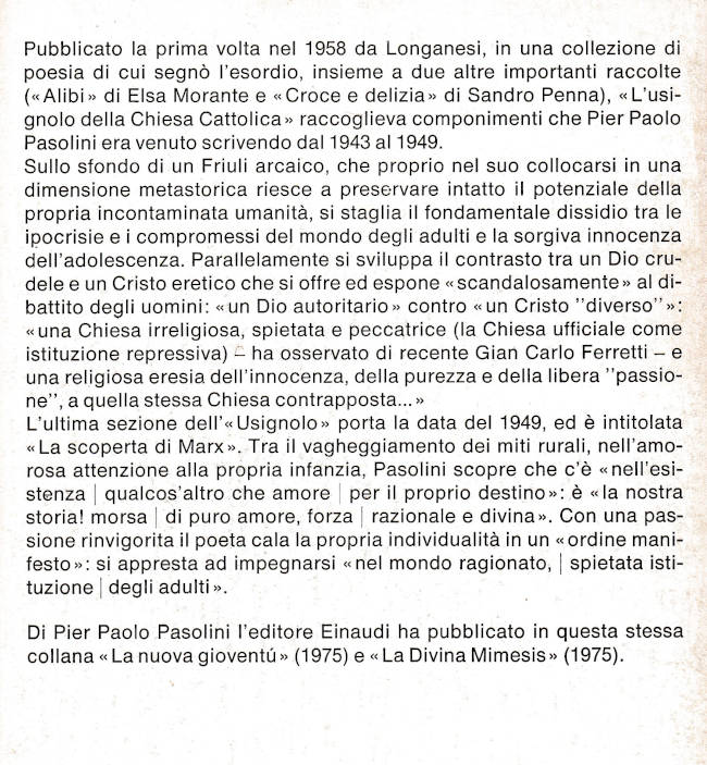 | Titolo completo | L'usignolo della Chiesa cattolica / Pier Paolo Pasolini |