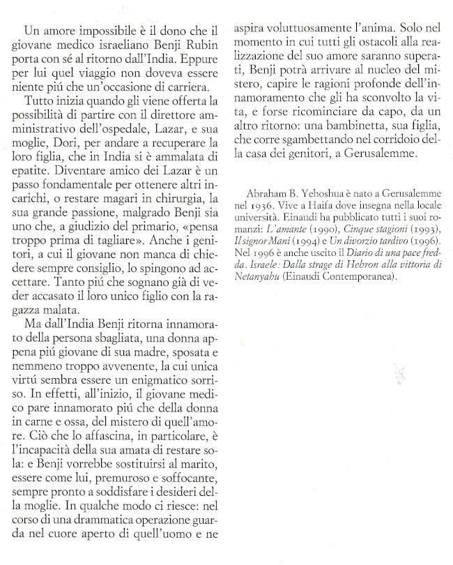 | Titolo completo | Ritorno dall'India / Abraham B. Yehoshua ; traduzione di Alessandro Guetta ed Elena Loewenthal |