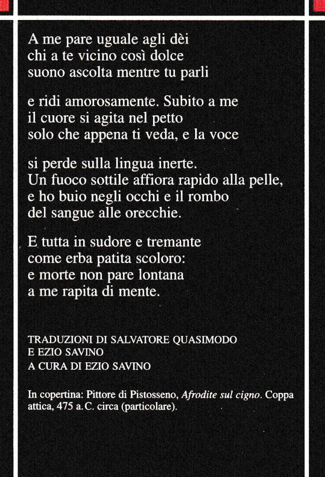 | Titolo completo | Liriche e frammenti / Saffo ; traduzione di Salvatore Quasimodo e Ezio Savino ; a cura di Ezio Savino |