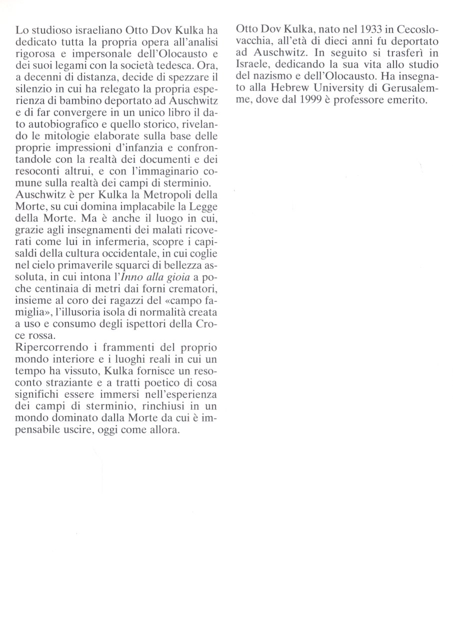Il tema è il rapporto tra il ricordo e l’immaginazione, tra la memoria e la disciplina della ricerca storica insieme, naturalmente, a tutti i suoi limiti e le sue difficoltà. L’obiettivo, come scrive l’autore, non è scrivere un memoir quanto piuttosto “sondare la memoria”. Kulka ha raccolto negli anni materiale molto differente: pagine di diario, fotografie dai suoi successivi viaggi ad Auschwitz (il primo dopo il 1945, quello con cui comincia il libro, risale al 1978, in occasione di un convegno di storici in Polonia), riflessioni, poesie, trascrizione di interviste audio (quasi sempre in forma di monologhi). Ne emerge una descrizione insolita, un tentativo di ricostruire, attraverso il ricordo, i paesaggi di quella che l’autore chiama la propria individuale “metropoli della morte”. Kulka, nato nel 1933 nell’allora Cecoslovacchia, venne deportato insieme a sua madre dapprima a Theresienstadt. In seguito, nel 1943, sempre insieme a sua madre varcò l’ingresso di Auschwitz, dove rimase per qualche tempo in un “campo famiglia”, una particolare sezione del campo di concentramento il cui scopo non è ancora chiaro agli storici, uomini donne e bambini non venivano infatti divisi e i prigionieri erano autorizzati a portare i loro abiti, e che tuttavia ebbe vita breve. Attraverso i ricordi, raccolti con attenzione nel corso degli anni, emerge un paesaggio che Kulka non può che descrivere in termini mitologici. Ad Auschwitz regnava “la legge immutabile della Grande Morte” e proprio sotto l’egida di questa legge il giovane Kulka compie le sue prime esperienze formative. È nel campo, infatti, che per la prima volta, grazie a un detenuto che, come lui, era stato ricoverato per malattia, apprende i grandi pilastri della cultura occidentale; del campo Kulka cerca di descrivere quale fosse la sua percezione, con gli occhi di un bambino di dieci anni, della deforme concezione di giustizia che vi regnava (crede di ritrovarne un esempio nel grande modello della colonia penale kafkiana); al linguaggio privato e ai personaggi mitologici di Auschwitz (come Onkel Hlad e Onkel Ma Vet, rispettivamente «Zio Fame» e «Zio Morte» in ceco e in ebraico, nomi con cui i prigionieri cercavano di comunicare, via lettera, la tragicità della loro situazione a coloro che ancora non vi erano giunti) Kulka dedica pagine di un’incredibile profondità, nella consapevolezza che questo suo tentativo non può, e non deve, essere inteso come uno sforzo complementare alla ricerca storica, ma come qualcosa di completamente diverso, che ad essa si può solo affiancare, senza però esservi paragonata. La descrizione di quella che doveva essere la percezione dello scrittore bambino si interseca nel libro alla sue successive ricerche, come ad esempio nel capitolo in cui descrive come sua madre riuscì a lasciare Auschwitz, per poi però trovare la morte, poco lontano, come successivamente Kulka dovette scoprire. È dunque la relazione tra i ricordi di un bambino e il lavoro dello storico (dove il bambino e lo storico sono la stessa persona) il tema forse più importante di questo libro. Non è un caso che Kulka abbia deciso, in fondo al proprio testo, di riportarvi anche un suo saggio accademico sulla storia sociale dell’ebraismo e i suoi limiti. Ed è sempre con una riflessione sui limiti della storia, attraverso una citazione kafkiana, che il testo si apre: la storia, che cerca di spiegare l’inspiegabile, e che tuttavia, non può che a sua volta nell’inspiegabile finire sempre di nuovo. Enrico Lucca | |