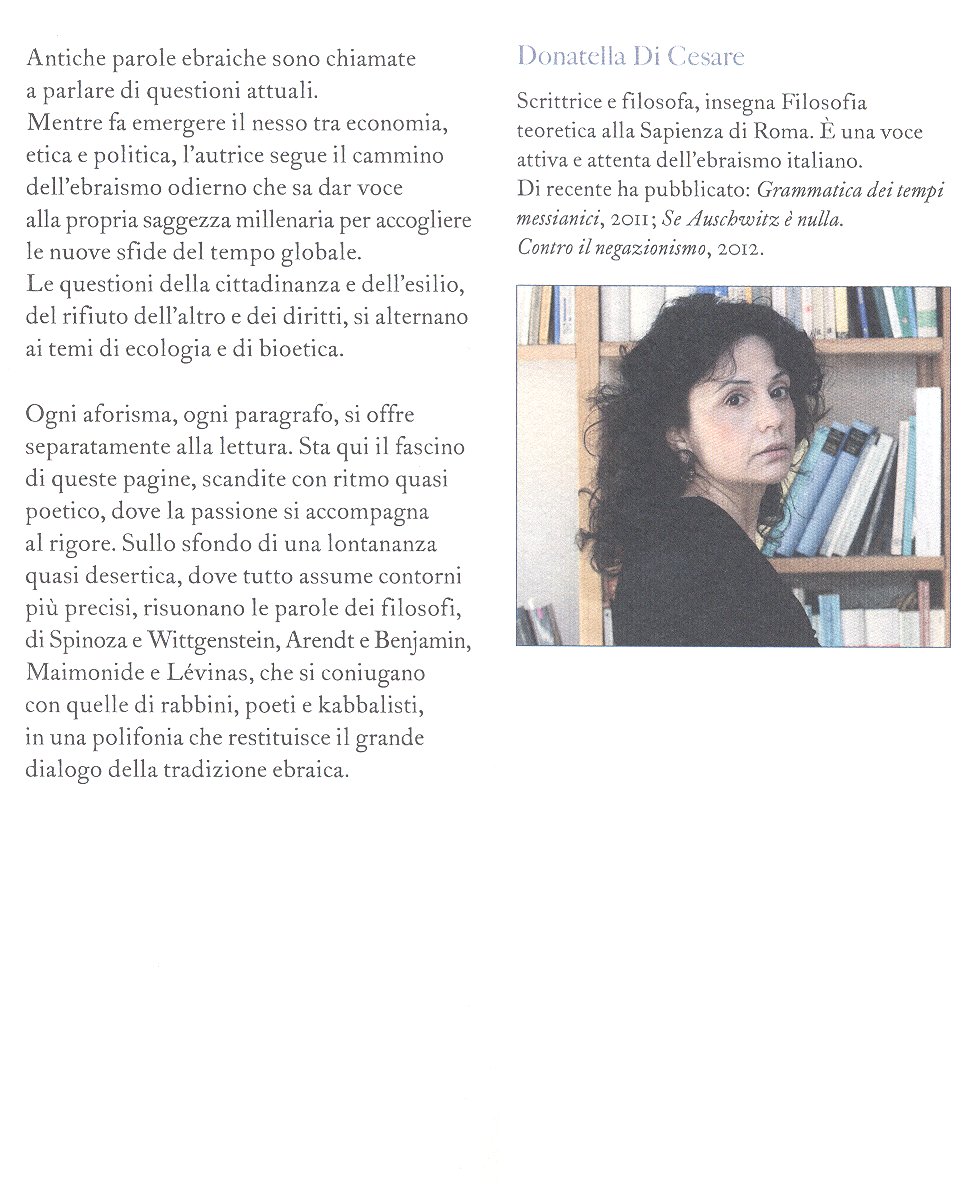 Come noto, l’ebraismo è anzitutto un’ortoprassi, un modo pratico di condurre la vita. E proprio per questa sua ricaduta sul pratico, l’ebreo è colui che si differenzia dagli altri, vivendo chiuso in una prassi comunitaria, che sembra creare un solco incolmabile col mondo circostante. L’ebreo è colui che non mangia come gli altri, che veste in modo differente, che vive un tempo diverso. Un’interpretazione riduzionistica dell’etica ebraica smentita da questo libro di Donatella Di Cesare, filosofa romana che da tempo conduce una riflessione a cavallo fra categorie ebraiche e filosofiche nel solco della miglior tradizione levinassiana. L’analisi di Di Cesare restituisce dignità teorica all’ebraismo, mostrando come la sua pratica sia portatrice di una visione coerente, che, piuttosto che smentire l’ideale di un’uguaglianza di tutti gli individui, come spesso le viene rimproverato, chiede che si concretizzi in un piano normativo ed in dei confini geografici, senza i quali si disperderebbe al vento. Un approccio che contrasta con quel “sogno dell’illimitato”, che, ci ricorda l’autrice, sembra caratterizzare l’attuale società globalizzata, dove sotto mentite spoglie si nasconde un progetto egemonico di una cultura su tutte le altre. Ridando dignità allo sfondo etico ebraico, l’autrice riesce a ricostruire anche il senso di quella pratica che sembrava solo il segno di un particolarismo esasperato. Azioni come il rispetto del Sabato, il giorno del riposo, o la Tzedakàh, termine impropriamente tradotto con “elemosina”, hanno un valore politico, come tentativo di preparare una società dove non abbia corso la dialettica del servo e del signore di hegeliana memoria. Non, dunque, segno di chiusura e separazione, ma di apertura alla dignità di tutti gli individui, “della vedova, dell’orfano…” e di tutti gli esclusi. Sentiamo l’autrice: «La rivoluzione è evento che irrompe, improvviso e imprevedibile, qui e ora. A ogni Shabbat, nel ricordo dell’uscita dall’Egitto (zecher leietzia’at Mitzraim), il popolo ebraico ri-vive la liberazione. Il Dio di Israele spinge alla rivolta, all’esodo. E questa rivoluzione, che ricorre ogni Shabbat, e viene potenziandosi secondo il ritmo del sette, fino all’anno dello Yovèl, in cui le terre saranno restituite, i debiti rimessi, gli schiavi liberati, non potrà essere se non una “rivoluzione permanente” […] Per Israele la rivoluzione è concepita come costituzione, la costituzione come rivoluzione». L’insofferenza occidentale verso l’ebraismo nasce proprio da qui, dalla sua capacità di fare da argine ad un progetto assimilazionistico, dall’autrice ricondotto ad una matrice cristiana, che pratica la relazione fra differenze come una redutio ad unum. Questo è anche l’aspetto più universale del particolarismo ebraico: un’etica del limite non contrasta gli ideali universalistici, semmai si offre come imprescindibile momento di concretizzazione, perché, come recita il titolo del libro, “La giustizia deve essere di questo mondo”. Un messaggio ancor più forte in un mondo che spesso “esporta” i propri valori universali con le armi.