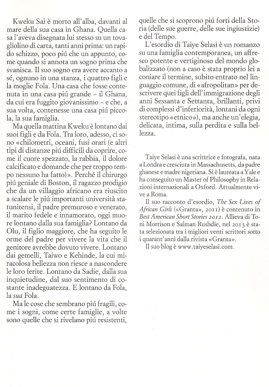 È inutile amare con tanta forza, perché la forza non viaggia, non trattiene, non protegge, non va dove va chi amiamo, non fa da scudo – eppure quale altro modo di amare è possibile? Pubblicato da Einaudi etradottocon il delicato titoloLa bellezza delle cose fragili, il romanzo d’esordio della scrittrice Taiye Selasi si presenta come un mosaico inedito dell’attuale mondo globalizzato. L’autrice, la cui stessa biografia delinea una mappa geografica, perché nata a Londra, cresciuta negli Stati Uniti da padre ghanese e madre nigeriana, e attualmente residente a Roma, racconta l’universo complesso della famiglia contemporanea cosmopolita, dove il processo di globalizzazione spinge gli individui a riorganizzare il proprio senso di appartenenza e a diventare cittadini del mondo che costruiscono nel movimento il proprio legame con i luoghi in cui scelgono di vivere. La storia raccontata è quella della famiglia Sai composta dal padre (ghanese) Kweku, la madre (nigeriana) Fola e i loro quattro figli, le cui vicende si dipanano fra i tre continenti dell’America, dell’Africa e dell’Europa e fra i tanti luoghi interiori dove, per la complessità dei legami di sangue “ci si ritrova e ci si riperde in un movimento infinito”, alla ricerca della propria identità. In apertura del romanzo, Taiye Selasi descrive la scena dell’infarto di Kweku nel giardino di casa in Ghana, utilizzando dettagli di rara bellezza mentre costruisce un mondo dove “l’investigazione dell’esperienza umana e la creazione della stessa” sono vie privilegiate per sondare l’animo umano. Kweku, africano immigrato in America alla ricerca di un futuro migliore, era diventato uno dei più bravi chirurghi di Boston. Ma il licenziamento illegittimo per un errore di cui non aveva colpa e quelle parole “lei non è stato all’altezza” lo rigettano in uno stato di profonda vergogna e umiliazione che spezzerà la sua vita, tanto da condurlo ad abbandonare la famiglia e ritornare nella terra d’origine, sposare un'altra donna, scoprirsi capace di una “delicatezza mai conosciuta prima”, e vivere in una casa che lui stesso aveva disegnato. Dopo sedici anni da quella partenza eccolo “disteso a faccia a terra e sorride”, lui “nato nella polvere, morto in mezzo all’erba”, dove una farfalla, “indifferente alla bellezza, al contrasto, alla perdita (…) batte le ali una sola volta e vola via”. Nell’intervallo dei due giorni che intercorrono tra la notizia del decesso e il riunirsi della famiglia ad Accra per ricordare lo scomparso, Taiye Selasi ci accompagna nella ricerca faticosa di una ricomposizione affettiva attraverso l’impiego del flashback, dove le parole si fanno strumento di una lenta indagine delle trame relazionali e dei labirinti interiori, viatico di un possibile e accettabile orizzonte di senso. La ferita esistenziale di Kweku non ha spezzato soltanto il suo cammino personale, ma ha lasciato tracce indelebili nell’esistenza di ogni membro della famiglia. Sui figli soprattutto, che, cresciuti e affermati in giro per il mondo, sono legati tra loro dalle diverse forme di uno stesso dolore, che il lettore conosce via via che l’autrice ricostruisce le trame delle loro biografie. Troviamo, così, Olu dall’apparente impenetrabilità, il figlio più grande e più vicino alla madre, che sceglierà di seguire le orme del padre e diventare medico. I due geniali gemelli, Taiwo dalla bellezza sconvolgente - “come avvolta in un aura di mistero”- e Kehinde, dotato di rara sensibilità e qualità artistiche, gemelli che dopo la separazione dei genitori subiranno un’atroce iniziazione sessuale in Africa. Questo drammatico evento segnerà per sempre le loro esistenze e il rapporto che costruiranno con se stessi, con gli altri, con il mondo. Seppur percorrendo cammini diversi, essi sapranno attingere all’unicità del loro legame, fatto di fragilità e insieme di forza, perché come ricorda una leggenda africana i gemelli “sono due metà di uno stesso spirito; (…) il secondo gemello, meno affascinato dalle cose del mondo rispetto al primo, viene sulla terra con grande riluttanza e vi rimane con un maggiore sforzo, consumato dalla nostalgia per i regni spirituali”. Infine Sadie, la più piccola dei fratelli che alla notizia della morte del padre “avverte solo la distanza” per i lunghi anni riempiti d’assenza. Lei che, in qualsiasi contesto sociale, a confronto con gli altri si scopre in difetto di “un dono” e, sempre alle prese con i complicati rapporti che intessono l’esistenza, si mostra incapace di trovare una vita serena. Con il romanzo La bellezza delle cose fragili la Selasi ci consegna una narrazione che parla della Vita e ci ricorda che ad accompagnarci e modellarci lungo i nostri percorsi sono proprio le piccole cose, quelle che solitamente ci sfuggono. Imparare ad ascoltare e prendersi cura delle emozioni, dei sentimenti, degli affetti aiuta a superare “chilometri, oceani, fusi orari, e altri tipi di distanze più difficili da coprire” e riscoprire la bellezza di ciò che, nella vita di ciascuno di noi, è fragile. “Abbiamo fatto quello che sapevamo fare. Andare via. (…) Lascia che loro imparino a rimanere”, sono le parole di una consapevolezza faticosamente raggiunta quando i fili delle diverse strade si annodano e ognuno scopre che solo l’amore e la forza della verità possono restituire nuove possibilità di pensare se stessi, il mondo, la Storia e, forse, potersi finalmente sentire “a casa”. Scarica PDF | |