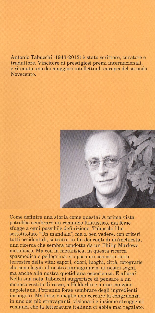 “Sto cercando di arrivare ad un centro, ho percorso molti circoli concentrici. Mi consideri solo uno che cerca… Antonio Tabucchi (Pisa 1943 - Lisbona 2012) è considerato una delle voci più rappresentative della letteratura europea. Narratore, saggista, traduttore in italiano di molte opere di Fernando Pessoa, è stato docente di letteratura portoghese a Siena. Ha ricevuto numerosi premi in Italia, fra cui il Pen Club Italiano, il Premio Campiello e il Premio Viareggio-Rèpaci e prestigiosi riconoscimenti all’estero, fra cui il Prix Médicis Etranger, il Prix Européen de la Littérature e il Prix Méditerranée in Francia. Per Isabel. Un mandala, è il primo libro postumo e inedito di Tabucchi. Nella preziosa nota finale al testo, cortesemente concessa da Maria José de Lancastre, consorte di Tabucchi, e da Carlo Feltrinelli, troviamo alcuni ragguagli sui particolari che hanno contribuito alla costituzione del manoscritto. Definito dall’autore stesso un testo di finzione, “un romanzo strambo, una creatura strana come un coleottero sconosciuto rimasto fossilizzato su un sasso”, l’opera è stata stesa nel corso di alcuni anni su dei quaderni scolastici e dettata integralmente a Vecchiano nel 1996. L’autore svela che ispirazione del romanzo, che contiene pagine di pregiata e ardua letteratura, sono contemporaneamente stati: la visione d’un monaco vestito di rosso che, in una notte d’estate, ha disegnato, per Tabucchi stesso, un mandala della Coscienza, un breve scritto del poeta tedesco Holderlin e un volo, frutto della fantasia, sulla città di Napoli… Waclaw, detto Tadeus, personaggio misterioso e tenace, proveniente da “Sirio, costellazione del Cane Maggiore” (come ama dire ai semplici), si mette alla ricerca di Isabel, donna conosciuta molti anni prima, ma di cui ha perso le tracce. Come in un mandala, immagine simbolica diffusa nel mondo orientale e nella tradizione buddista atta a favorire la meditazione, l'autore procede per centri concentrici, di voce in voce, verso la ricerca di una possibile verità, di un’ultima comprensione. Vengono percorsi nove cerchi denominati evocazione, orientamento, assorbimento, reintegrazione, immagine, comunicazione, temporalità, dilatazione, realizzazione-ritorno ritmati da un insieme di incontri correlati che intensificano l’investigazione. Gli interlocutori sono supposti testimoni delle vicende di Isabel, contatti del passato oppure depositari di informazioni destinate all’oblio. Con spiccata arte narrativa vengono delineate le atmosfere e gli echi politici della dittatura e del regime di Salazar nel Portogallo degli anni ’60. Negli accurati dialoghi del protagonista con l’amica Monica, con la tata Bi, con la studentessa americana conosciuta all’università di Lisbona, con un secondino capoverdiano e un fotografo metafisico, la ricerca simbolica di Isabel converge sempre più verso il centro. La ricerca di e intorno a Isabel tende ad ampliarsi anche dal punto di vista geografico. Oltre alle località portoghesi, a cominciare dalla suggestiva Lisbona, con i suoi ristoranti e gastronomie, con la monotonia tipica della città portuale spesso avvolta nella nebbia, adagiata sul ritmo del fado, la ricerca prosegue a Macao, nelle Alpi Svizzere e a Napoli, coinvolgendo nuovi informatori, anche del tutto inaspettati: un sacerdote, un'astronoma, un poeta in fin di vita, un teosofo europeo e un violinista. Nel peregrinare tortuoso alla ricerca della persona persa - e alla fine ritrovata -, il viaggio svela di essere infine un’indagine di se stessi. Tadeus, dopo aver affermato: “ho scritto dei libri, e' questo il mio peccato 'perché' avevano una sorta di arroganza sulla realtà”, lascia che Isabel gli doni un suggerimento (in forma di voce fuoricampo rivolta alla coscienza): “[…] Sappi bene una cosa, non sei tu che hai ritrovato me, sono io che ho ritrovato te, tu credi di aver compiuto una ricerca per me, ma la tua ricerca era solo per te stesso. Sappi che il tuo centro e' il mio nulla, il nulla in cui io ora mi trovo”. Nel racconto s’intrecciano e s’intravedono contemporaneamente almeno due piani: uno simbolico, allusivo, quasi onirico, l’altro più tangibile, concreto, immediato, aperto ai sensi e, a tratti, a una raffinata ironia. Nell’insieme la diversità di registri narrativi, così apparentemente diversi, crea una tensione ma anche un’aspirazione al sublime e al lirico. La scrittura tradisce la ricerca di una visione spirituale dell’esistenza che nasce dalla condizione di caducità degli umani e dai limiti che la vita impone. Scarica PDF | |