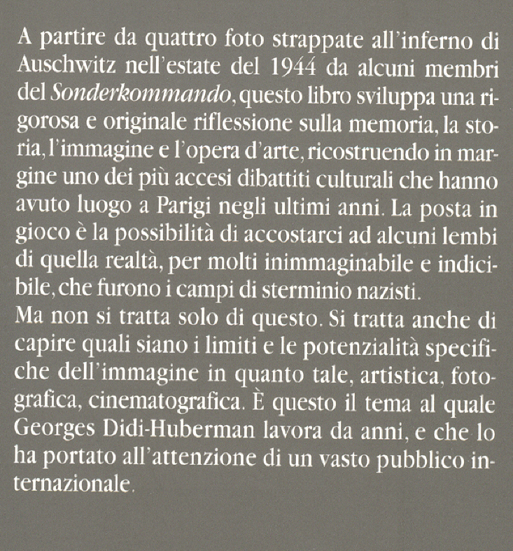 Il saggio di Didi-Huberman è uscito per Cortina nel 2005. Si crede utile porre nuovamente attenzione al testo, per due ordini di ragione, che corrispondono ai due temi portanti del saggio: in primis perché il dibattito sul negazionismo è sfortunatamente attuale, ed è questa la ragione politica, in secondo luogo perché il saggio pone in luce temi rilevanti in ambito estetico e teoretico, che chiamano in causa l'eredità filosofica occidentale e alcuni paradigmi della tradizione ebraica.