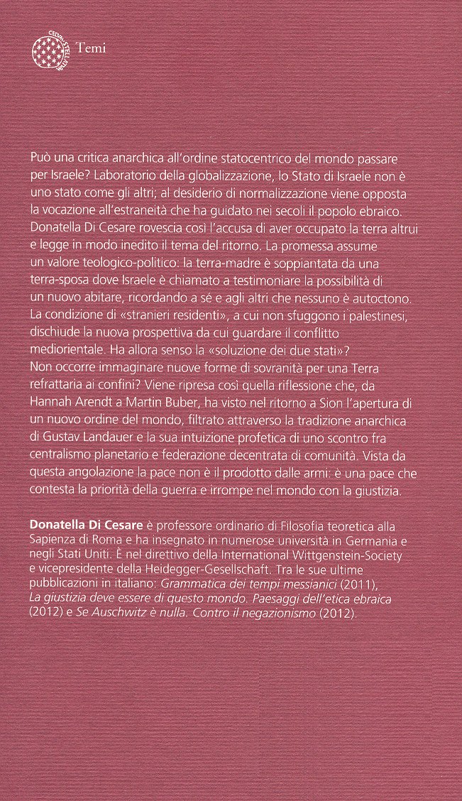 L'ultimo testo della filosofa D. Di Cesare sembrerebbe muovere da una doppia esigenza : da una parte chiarire le categorie linguistiche con le quali si è soliti guardare al conflitto arabo-israeliano, dall'altra analizzare alcune delle categorie della filosofia occidentale mediante il rapporto tra l'esistenza d'Israele, nella sua doppia accezione semantica di Am (popolo di) Israel e Medinat (stato di) Israel e la corrente libertaria del socialismo, da G. Landauer al Kulturzionismus di Buber.