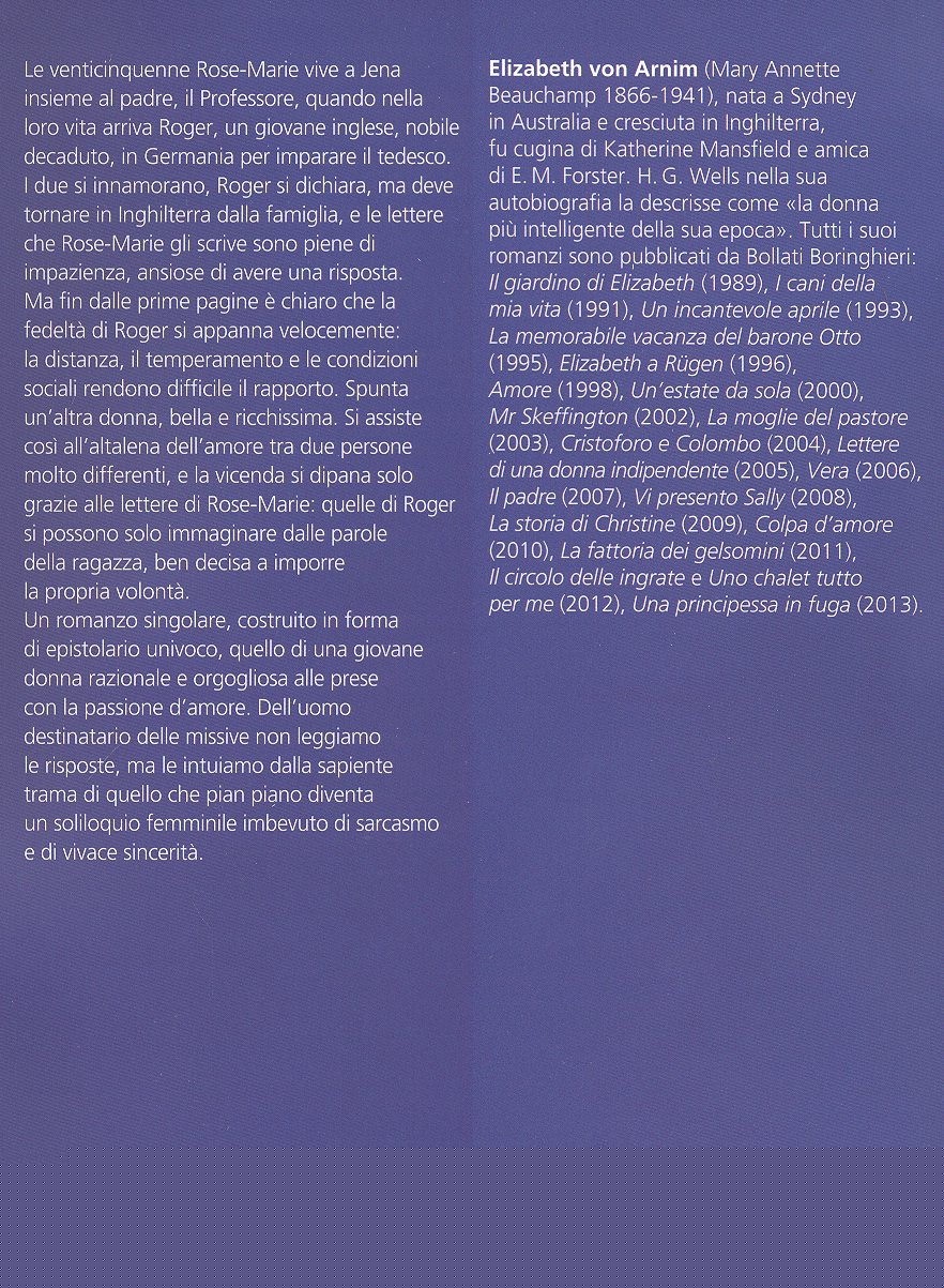 Nel marzo del 2014, la Casa Editrice Bollati Boringhieri pubblica la seconda edizione del romanzo epistolare “Una donna indipendente” di Elizabeth von Arnim, pubblicato già nel 2005. Scritto nel 1907, il romanzo si rivela un prezioso gioiello letterario per la modernità delle idee espresse, per il raffinato spirito critico e di ricerca - che guida l’animo umano a trovare negli attimi della vita quotidiana il senso ed il valore dell’esistenza -, per la sensibilità e la ricchezza interiore del genio femminile di cui dipinge i tratti. Elizabeth von Arnim (Mary Annette Beauchamp 1866-1941), nata a Sydney in Australia e cresciuta in Inghilterra, fu cugina di Katherine Mansfield e amica di E.M. Forster. H.G. Wells nella sua autobiografia la descrisse come "la donna più intelligente della sua epoca". Tutti i suoi romanzi sono pubblicati da Bollati Boringhieri. “Abbiamo bisogno di spazio, tempo e concentrazione per arrivare alla vera, suprema essenza della vita. E io penso che la vera, suprema essenza della vita sia in ogni cosa, non importa quale, su cui riesca a fissarsi la nostra indisturbata attenzione”. La venticinquenne Rose-Marie Schmit di Jena, cresciuta nella fede e nel culto di Goethe, che considera tuttavia scrittore minore, vive un’intensa relazione di amicizia e di amore, espressa nella forma epistolare, con il giovane inglese Roger. Di nobile rango sociale, anche se ormai in decadenza, intento ad intraprendere una brillante carriera diplomatica, Roger Anstruther trascorre un annonella casa degli Schmit per imparare il tedesco con il padre di Rose-Marie, professore di letteratura. Prima di ripartire per l’Inghilterra lo studente Roger dichiara il suo amore per la giovane, la quale non avrebbe mai immaginato di destare tanto interesse, lei appartenente ad una famiglia semplice e dignitosa, socialmente inferiore. Il tempo, la separazione, la mentalità e le differenze sociali determinano un cambiamento nella tonalità dei sentimenti: Mr.Roger Anstruther mostra ora interesse per Miss. Cheriton, donna giovane e ricca, oltre che sua connazionale. Il lettore non conosce direttamente il contenuto, i pensieri e le reazioni di Roger se non in forma indiretta dalle risposte di Rose-Marie. La ragazza le rivolge parole coraggiose e franche: “So che siete intelligente, che avete una mente brillante un intelletto assolutamente apprezzabile; ma a che serve quando il resto di voi è tanto debole. Siete di una cavillosità malsana…”. Oppure: “Quando riuscirete a vedere che esiste un tipo di splendore impossibile da misurare con il denaro o con il rango?”. La giovane Smith racconta con vivacità al “caro Roger”, divenuto poi il più distaccato “caro mr.Anstruther”, i fatti della quotidianità, le vicende della famiglia e della vita cittadina di Jena. FräuleinRose-Marie si rivela capace di disquisire con il suo confidente su ogni argomento, è in grado di fare acute osservazione sui comportamenti delle persone nelle situazioni sociali, sui loro pregiudizi e sulle maschere che adottano. Espone le proprie convinzioni con schiettezza, predilige uno scrittore piuttosto di un altro evidenziandone la differenza e svelando di eleggere l’acutezza di pensiero che trova sintonia ed elevazione nella propria anima. Molto spazio nelle lettere è dato alla descrizione della bellezza della natura e delle cose che possono essere guardate in modo diverso come il fascino delle stagioni: l’aprile con la sua freschezza e con il profumo dei germogli coperti di rugiada, il cumulo di bellezza nelle aiole piene di fiori. L’originalità della scrittura pone in evidenza la forte personalità della donna che con ironia e intelligenza si prende gioco dell’uomo che ancora ama, nonostante Roger non si renda conto: “Ma credi forse che solo per il fatto di donarti tutto questo io ti doni anche la mia anima? Che sprechi la mia esistenza a compiangermi? Tu non vali tutto questo. Difficile che tu possa valer tanto. Sei uno smidollato. La mia vita sarà meravigliosa anche senza di te. Non mi sento defraudata della benché minima occasione di felicità”. Rose-Marie ha la consapevolezza di voler essere una donna adulta, in pieno possesso delle facoltà, che può godere pienamente la vita in quanto ha compreso che l’unico aiuto è quello che si trae da se stessi, e che non va cercato al di fuori di se stessi … “Una donna indipendente”,consente una lettura piacevole e raffinata, rigenerante dello spirito. Scarica PDF | |