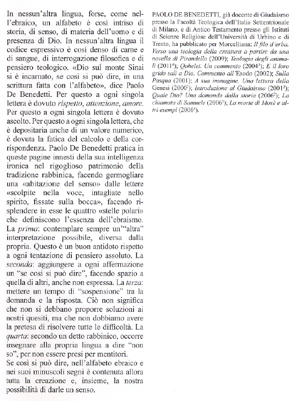 “Concederò nella mia casa e dentro le mie mura un memoriale e un nome ... darò loro un nome eterno che non sarà mai cancellato". Basterebbe questo verso del profeta Isaia (56: 5) per comprendere la centralità della parola nella tradizione ebraica. Una centralità del linguaggio riaffermata da questo bel dialogo fra Paolo De Benedetti, tra i massimi esperti italiani di giudaistica e singolare figura di intersezione fra cultura ebraica e cristiana, e Gabriella Caramore, ideatrice e conduttrice della celebre trasmissione radiofonica Uomini e profeti. “Del resto, - scrive la curatrice - in nessun’altra lingua, forse, come nell’ebraico, un alfabeto è così intriso di storia, di senso, di materia dell’uomo e di presenza di Dio. In nessun’altra lingua, credo, il codice espressivo è così denso di carne e di sangue, di interrogazione filosofica e di pensiero teologico.” (p. 5).