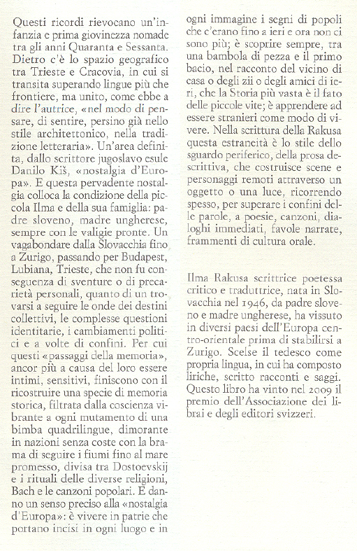 Basterebbe ripercorrere brevemente i titoli di alcuni dei racconti raccolti nel volume per avere un’idea di ciò che Ilma Rakusa ha voluto condividere di sé e del suo mondo: “Che importanza hanno le valigie”, “Giardino, treni”, “Confini”, “Iniziazione all’abbandono”, “”Strade, chiese”, “Del sentire la mancanza”, “Del dimenticare”.