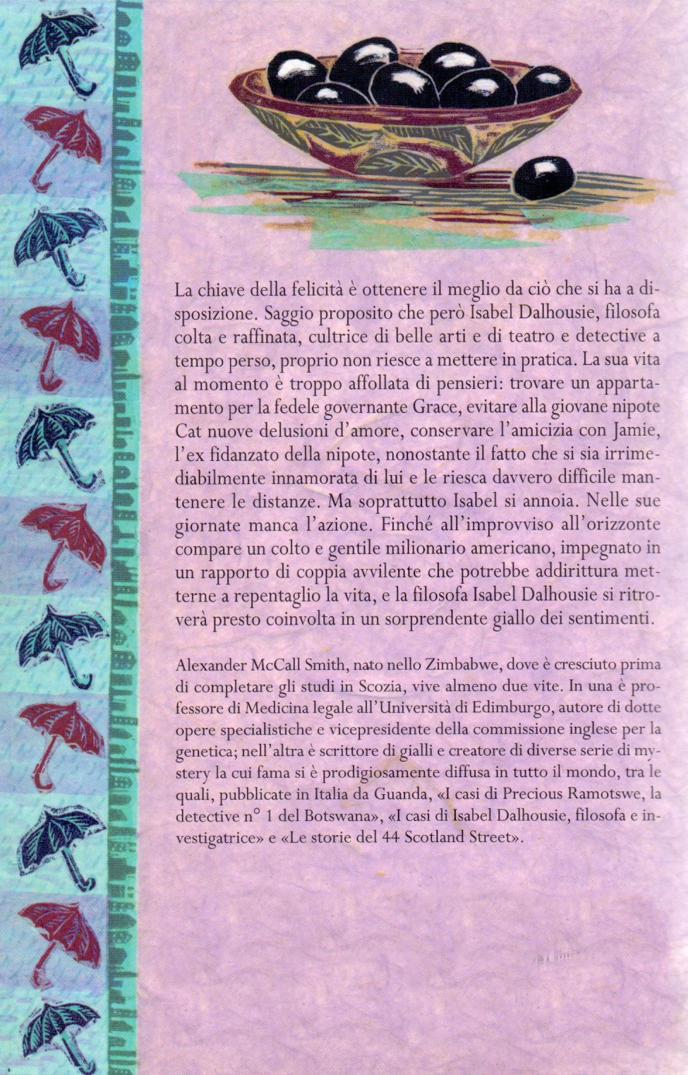 Alexander McCall Smith l’autore de Il club dei filosofi dilettanti è nato nello Zimbabwe e ha trascorso tutto il periodo dell’infanzia in Africa. Dopo aver compiuto gli studi inizia a lavorare in Scozia dove insegna medicina legale all’Università di Edimburgo. Oltre a pubblicare opere specialistiche e ad occuparsi di genetica, è autore della serie che ha come protagonista Precious Ramotswe e la sua Ladies' Detective Agency N.1. Il romanzo Il piacere sottile della pioggia scritto nel 2011 narra la vicenda di Isabel Dalhousie, filosofa e detective dilettante che vive nella bellissima città di Edimburgo. Persona colta e raffinata, Isabel dirige una rivista di etica applicata. Si dedica alla correzione di bozze, valuta accuratamente la presentazione di nuovi articoli che arrivano in redazione, cura la corrispondenza con i lettori, scrive soppesando ogni concetto e mostra interesse per argomenti su cui esprime le più diverse opinioni. E’ soprattutto la vita quotidiana che dà molto da pensare e tanto filo da torcere alla protagonista. A Isabel interessa guardare le situazioni degli altri, sapere di che cosa hanno bisogno, con la convinzione che non bisogna preoccuparsi solo del proprio piccolo mondo. Per questo offre consigli e sostegno alla nipote Cat, verso cui mostra una eccessiva premura. Dona parte delle sue ricchezze alla fedele e simpatica governante Grace, suscitando la contrarietà di chi ha una concezione diversa dell’aiuto verso il prossimo. Gli incontri con l’amico psichiatra Richard danno a Isabel l’opportunità di approfondire aspetti della sua persona e della sua vita da lei ritenuti assai importanti. In particolare, la questione del carattere, su cui Isabel ha già scritto un articolo, diventa motivo di coinvolgenti discussioni. Il carattere è immodificabile o è malleabile? In una persona Isabel apprezza il valore dell’impegno volto alla conoscenza e alla condivisione e ritiene che “comportarsi in modo eticamente impeccabile in coscienza non sia tanto problematico mentre in campo morale il difficile è costringersi a provare l’opposto di quello che sarebbero le tendenze fondamentali”. Pagine interessanti sono quelle in cui le riflessioni di Isabel guidano il lettore a porsi in ascolto del versante pratico dell’esistenza: il senso dell’arte ed il compito dell’artista di rispondere al mondo osservandolo e ricreandolo, le decisioni da prendere in situazioni reali, applicando l’etica a casi concreti, l’importanza delle azioni di ognuno in rapporto alla condivisione collettiva della madre Terra, ecc. Isabel arriverà a compromettersi anche nella vita privata e sentimentale, superando ogni calcolo e senso di colpa riuscirà a far sua la scelta di rimanere con l’amico Jami. Scarica PDF | |