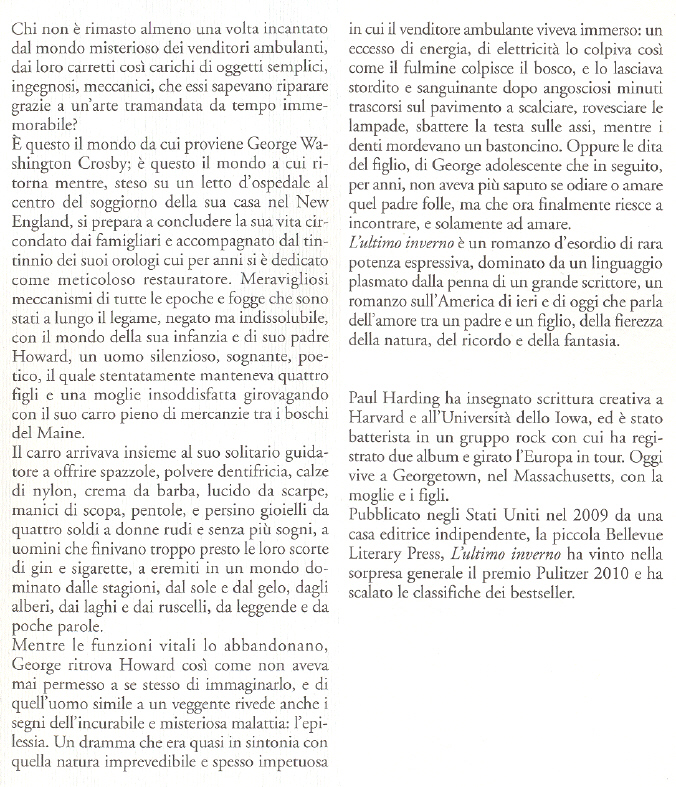 “La luce cambia, sbattiamo gli occhi, vediamo il mondo da una prospettiva appena differente e il nostro posto al suo interno è già cambiato, e continuerà a cambiare, all’infinito”. L’ultimo invernoè il romanzo d’esordio dello scrittore americano Paul Harding, ex docente di scrittura creativa ad Harvard e batterista di una band rock. Dopo diversi tentativi di trovare qualcuno che lo pubblichi, l’autore trova riscontro positivo presso una piccola casa editrice “no profit”, la Bellevue Literary Press, che accetta la sfida e nel 2009 pubblica il romanzo con il titolo originale Tinkers. Attraverso un virale passa parola L’ultimo inverno riescea scalare rapidamente le classifiche, fino ad aggiudicarsi nel 2010 l’importante premio letterario Pulitzer. La storia narrata è ambientata in Maine, negli Stati Uniti d’America, e racconta gli ultimi otto giorni dell’ormai anziano George Washington Crosby. Circondato dall’affetto dei familiari e dagli orologi a cui con passione si è dedicato fino a quel momento, George ripercorre i sentieri della memoria e dell’immaginazione mentre riaffiorano frammenti di vita che hanno segnato la sua identità. Nella mente dell’anziano orologiaio, le immagini più nitide sono quelle che rammentano l’infanzia, in particolar modo la figura del padre, persona nei confronti della quale George ha sempre provato un misto di amore e di rabbia. Howard Crosby, padre del protagonista, non fu un uomo dalla vita facile: per mantenere quattro figli dovette lavorare sodo, nei boschi sperduti del Maine, il mestiere di venditore ambulante garantiva ben poco. Ma non era questo ciò che determinò Howard ad abbandonare la propria casa e andarsene lontano, lasciando un vuoto incolmabile nel cuore del figlio George. Il ‘Grande Male’, come veniva definita l’epilessia, aveva colpito il padre Howard fin dalla giovane età ed inevitabilmente anche la famiglia doveva fare i conti con questa realtà. Dopo alcuni tristi eventi, Howard decise di lasciare tutto e andarsene perché “a farlo disperare era l’idea che sua moglie lo considerasse un povero scemo, un ambulante da quattro soldi, un aspirante poeta che si riduceva a copiare pessimi versi trovati su riviste religiose da due penny, un epilettico, e non riuscisse a trovare alcun motivo per cambiare prospettiva e provare a vederlo in una luce migliore”. Alle vicende esistenziali dei personaggi fa da sfondo una natura in costante metamorfosi, che l’autore riesce a descrivere con toni di rara bellezza e forte impatto emotivo. La neve, gli animali, le piante, i boschi, la vegetazione, il sole e il buio della notte accompagnano il flusso delle emozioni che i personaggi provano, i loro stati d’animo e le loro visioni. Anche se il tema della morte in qualche modo permea quasi ogni pagina del libro e sembra decretare la fine di ogni legame, nella storia di George è proprio l’avvicinarsi della morte che mette in risalto il valore umano del personaggio che riesce a recuperare attraverso la memoria i legami recisi e quel necessario sentimento di riconciliazione con se stessi e con la propria storia. L’ultimo inverno è un romanzo austero che sviluppa molteplici temi come il rapporto con la malattia propria e degli altri, il tema della memoria, e quella del tempo interiore dal ritmo inconciliabile col tempo della storia. Scarica PDF | |